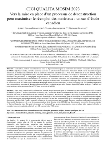 Nganmi Tchakouto, A., Boukherroub, T. et Drapeau, N. (2023) Vers la mise en place d’un processus de déconstruction pour maximiser le réemploi des matériaux : un cas d’étude canadien. Dans CIGI Qualita MOSIM 2023, Trois-Rivières, Québec, Canada DOI 10.60662/NNVW-8J20.