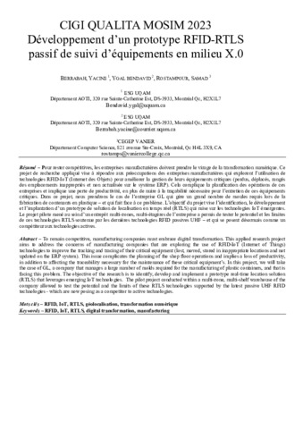 Berrabah, Y., Bendavid, Y. et Rostampour, S. (2023) Développement d’un prototype RFID-RTLS passif de suivi d’équipements en milieu X.0. Dans CIGI Qualita MOSIM 2023, Trois-Rivières, Québec, Canada DOI 10.60662/499c-as86.