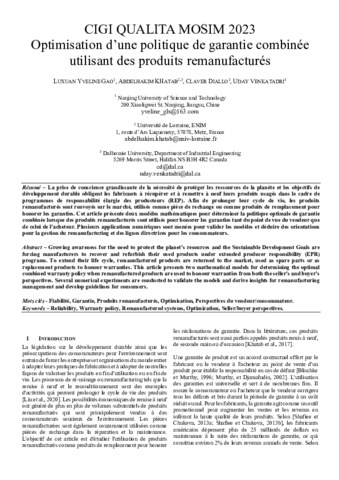 La prise de conscience grandissante de la nécessité de protéger les ressources de la planète et les objectifs de développement durable obligent les fabricants à récupérer et remettre à neuf leurs produits usagés dans le cadre de programmes de responsabilité élargie des producteurs (REP). Afin de prolonger leur cycle de vie, les produits remanufacturés sont renvoyés sur le marché, utilisés comme pièce de rechange ou comme produits de remplacement pour honorer les garanties. Cet article présente deux modèles mathématiques pour déterminer la politique optimale de garantie combinée lorsque des produits remanufacturés sont utilisés pour honorer les garanties tant du point de vue du vendeur que de celui de l'acheteur. Plusieurs applications numériques sont menées pour valider les modèles et déduire des orientations pour la gestion du remanufacturing et des lignes directrices pour les consommateurs.