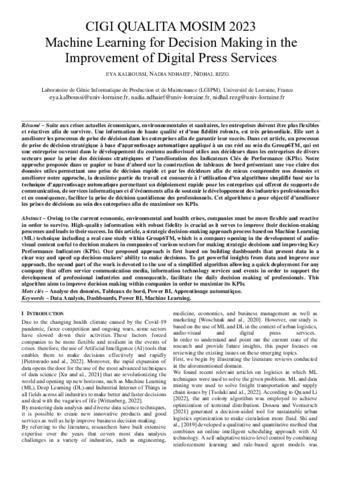 Kalboussi, E., Ndhaeif, N. et Rezg, N. (2023) Machine Learning for Decision Making in the Improvement of Digital Press Services. Dans CIGI Qualita MOSIM 2023, Trois-Rivières, Québec, Canada DOI 10.60662/7zw3-y832.