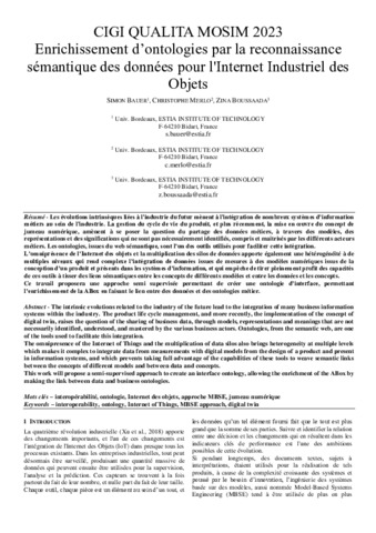 Bauer, S., Merlo, C. et Boussaada, Z. (2023) Enrichissement d’ontologies par la reconnaissance sémantique des données pour l'Internet Industriel des Objets. Dans CIGI Qualita MOSIM 2023, Trois-Rivières, Québec, Canada DOI 10.60662/7evd-ra10.