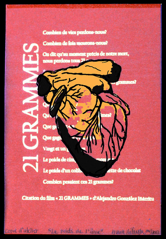 | Informations complémentaires: | Technique : Sérigraphie Édition rehaussée : non Dimensions (hauteur / largeur) de l’œuvre: 18cm X 12,3cm Support : Carton rouge et papier calque Copie d’atelier : oui Livre d’artistes : oui, «17e minute» Copie : c/a Inspiré du film : 21 grams, Alejandro González Iñárritu, États-Unis, 2003 |