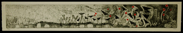 | Informations complémentaires: | Technique : Eau-forte, crayon aquarelle Édition rehaussée : oui Dimensions (hauteur / largeur) de l’oeuvre : 10cm X 72,5cm Support : papier chiffon Dimensions (hauteur / largeur) : 12,3cm X 75,7 cm Copie d’atelier : non Livre d’artistes : oui, «Variations d’impressions, métrognomes IV, métrique à six» Copie : 33/40 |