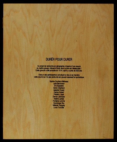 Couillard, Sophie, Berchman, Julie, Buissières, Éric, Charland, Denis, Forest, Isabelle, Hubert, Carine, Joyal, Frédérik, Labrosse, Darcia, Lahaie, Valérie, Leriche, Fontaine, Roy, Dominique, Tanguay, Mélanie et Turcotte, Louis (1999) Boîtier livre d'artiste «Durër pour durer». [Estampe]